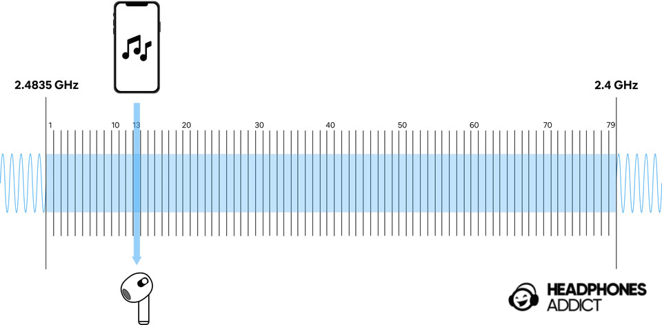Lorsque plusieurs écouteurs sans fil sont présents dans une même pièce, ils ne reçoivent pas les musiques émises par 2 téléphones simultanément, car il existe 79 fréquences (chaque smartphone et ses écouteurs associés échangent des informations via une fréquence sur les 79 possibles).