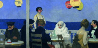 Dans l’œuvre “Soir bleu” la scène est triste alors même qu’elle représente une soirée festive. Aucun des personnages n’a d’interaction avec les autres, ils sont là et subissent leur soirée au lieu de la vivre. Les personnages sont lugubres, un clown qui fume, une femme très maquillée que l’on suppose être une prostituée, un homme à chapeau